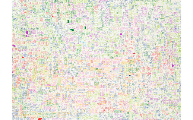 柴田龍平《かき消されたタイトル》(部分)2015年 Color gel pen, resin, acrylic on canvas 112.2 × 145.6 × 2.0 cm Courtesy of