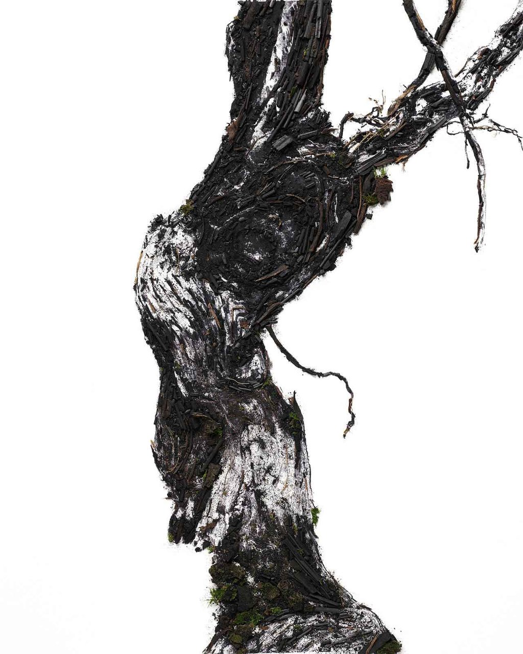 ルイナールを生み出すために必要な長い過程を知った彼は、人間と自然の結びつきを捉え、黒く染めた木片や木炭を使用してブドウの幹を表現する作品などを制作。この度、東京でも公開される。