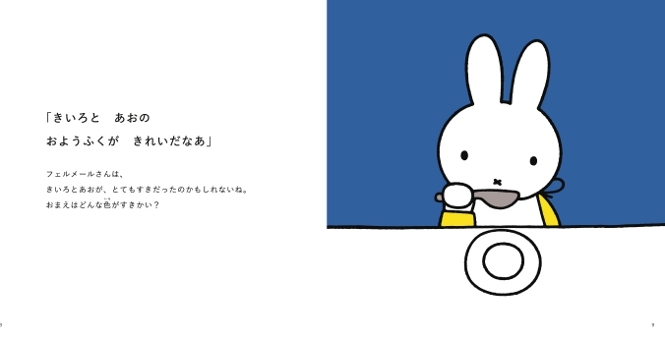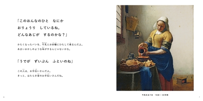 構成は、グラフィックデザイナーでアートディレクターとしても知られる菊地敦己氏、文章はコピーライターの国井美果氏が担当。子どもの素朴な疑問に対し、 “とうさん”が優しく解説したり、想像を育み、話が広がるように答えてくれるというカタチで物語は進む。さらに、フェルメールの絵画とミッフィーの絵がリズミカルに展開。シンプルな言葉のなかに絵に対するあらたな発見を感じられる仕掛けとなっている。