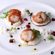 ・クラテッロで捲いたオマール海老のソテー ブッラータチーズ モデナ産バルサミコヴィネガー