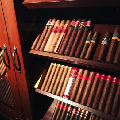 ウィスキー、ラム、ブランデーから、長野出身の店主が仕入れるフレッシュなフルーツを使った季節のカクテル、豆を挽いて淹れてくれるコーヒー、ロイヤルミルクティーもある。が、ここに来る客の多くが求めているのは葉巻だ。