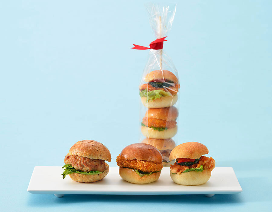 「チキン竜田+サルサソース」「ハンバーグ+マスタード」「コロッケ+カレー」。3種のパンを使ったミニサイズバーガーのセット。可愛らしい見た目も人気の秘訣。