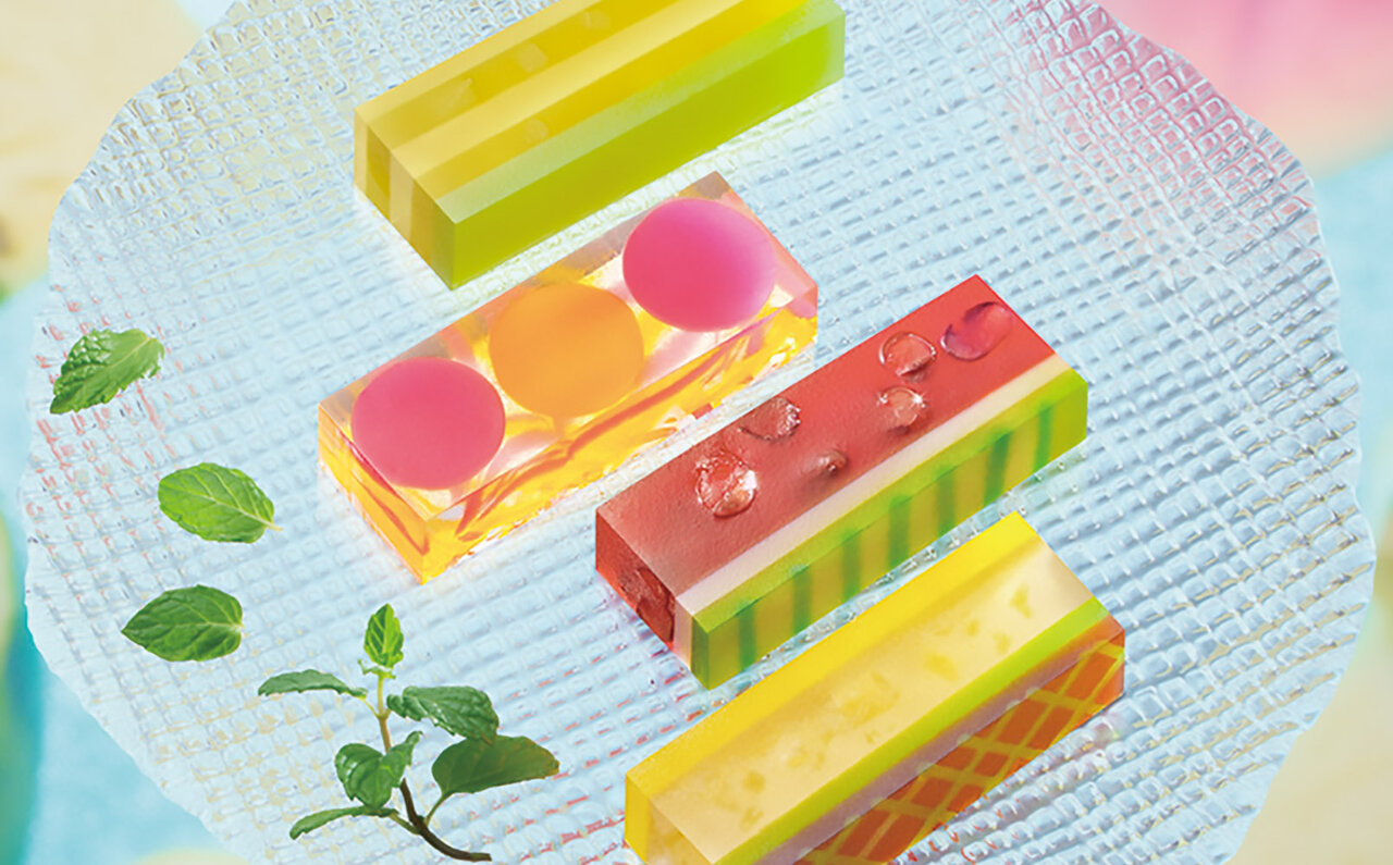 「れもん」「すいか」「白桃」に、トロピカルな味わいの「鳳梨(パイナップル)」が仲間入り。目にも楽しく涼やかな、錦玉羹の夏季限定ささらがたに仕上がっている。