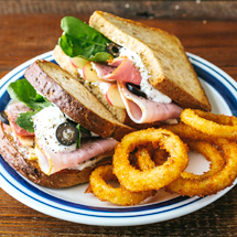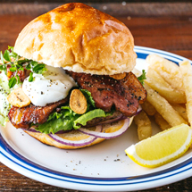 ハンバーガーには、摂氏0度から食材の凍る温度の間の温度帯で熟成させる「氷温熟成」といった、独自技術による食肉加工技術で名高い千葉県の「CHEF MEAT CHIGUSA」のベーコンやボンレスハムを贅沢に使用。さらに「よい牛乳は健康な牛から生まれ、健康な牛はよりよい牧草地で育まれる」という考えをモットーに、無農薬、無化学肥料の循環型有機農法を採用している北海道の「NORTH PLAIN FARM」の牛乳のおいしさをそのままチーズにした、スモークゴーダチーズがふんだんに使われている。