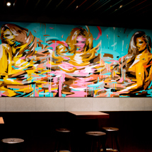店内にはライムストーンの壁にマッチしたフランス人家具デザイナー、ジャン・プルーヴェの名作スツールなど木製家具を設置。あたたかみのあるエレガントな雰囲気が演出されている。バー横にはDJスペースとVIPエリアが設けられ、最先端のサウンドシステムと、アーティスト小澤雅志氏による2枚の大型絵画が訪れる人を出迎える。