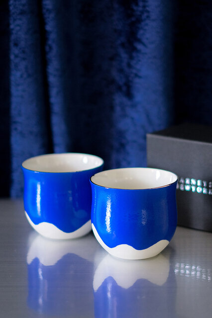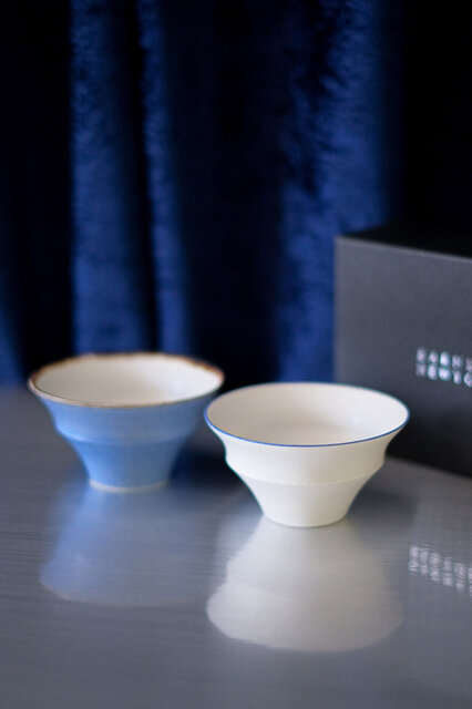 「獺祭BLUE」を楽しむための酒器も、特別なアイテムとしてセットに含まれている。酒器は、2名の著名な陶芸作家によって手作りされたもので、どちらも一つ一つが芸術作品としての価値を持つ。