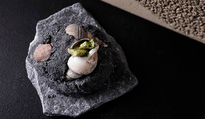 メニューには、旧石器時代をイメージした「巻き貝のアンモナイト化石仕立て」や、弥生時代の魚を粘土で包んで焼く料理から着想を得た「金目鯛の粘土仕立て」など、コースの前菜からデザートまで、過去から現在に至る各時代に使われていた食材や手法を用いて浜田料理長の独自の感性で表現される。