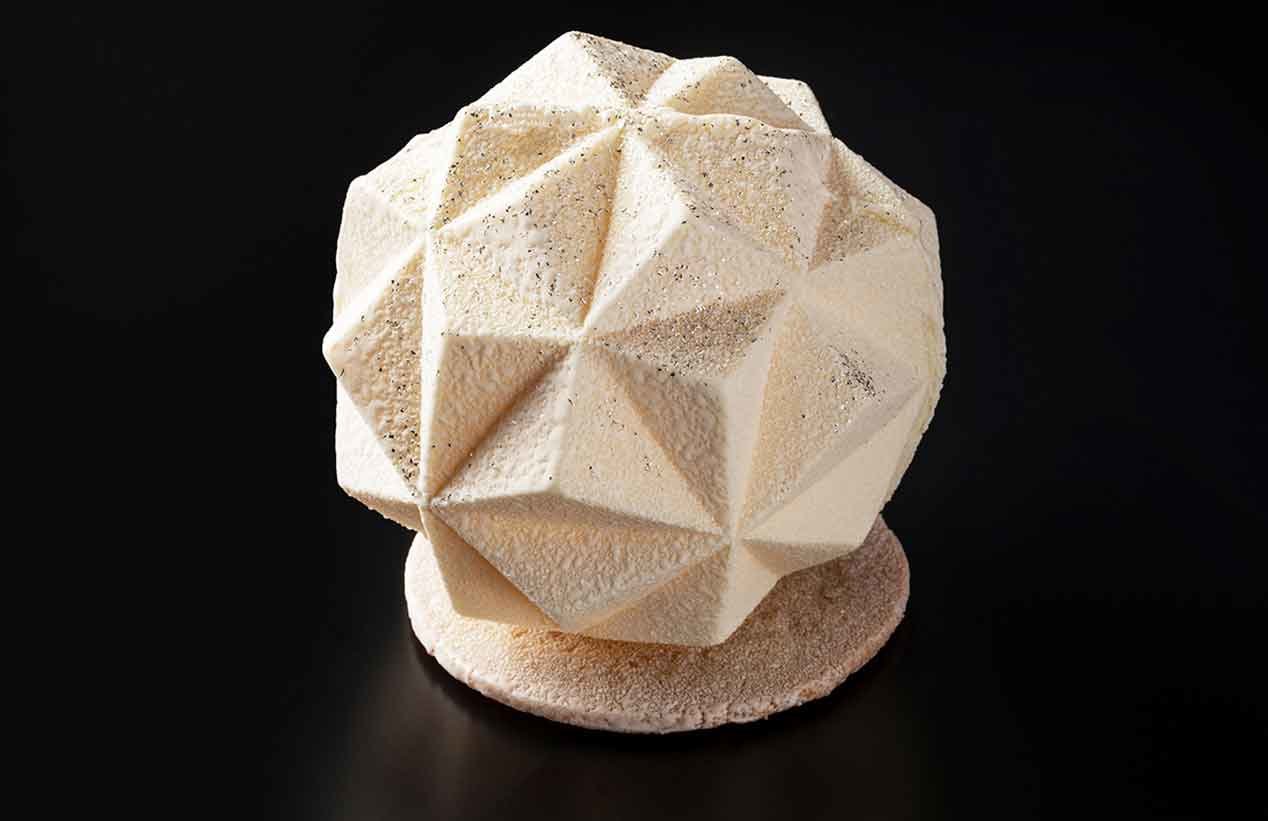クリスマスケーキ「フロマージュ プルーン」は、空から舞い降りる雪の欠片のような形が一際印象的な、口当たりなめらかなレアチーズケーキ。爽やかな南高梅とフルーティーな沖縄産マンゴーのジュレを中に忍ばせ、果実が織りなす香り豊かな味わいが楽しめる。