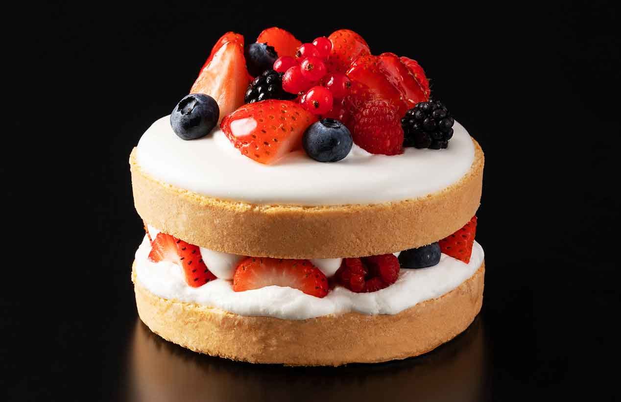 世代を問わず人気のショートケーキはアメリカンスタイル。甘さ控えめの真っ白なシャンティクリームに、ストロベリー、ブルーベリー、ラズベリー、ブラックベリーがふんだんにトッピングされ、ふわっと溶けるシャンティクリームの優しい甘さと、甘酸っぱいベリーの味わいが楽しめる。