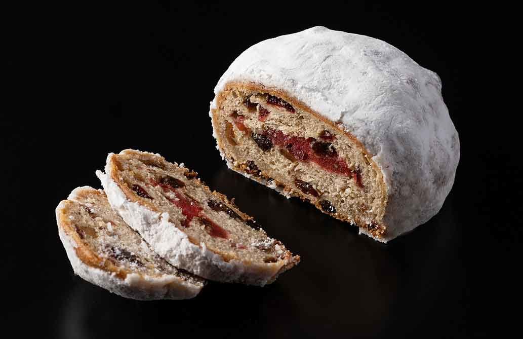 毎年好評のホテルオリジナルのシュトーレンは、レーズン、イチジク、オレンジなどのドライフルーツに、ピーカンやクルミなど数種のナッツをたっぷり練り込み、「メーカーズ マーク」のバーボンと3種のスパイスを使用した、味わいも香りも大人の逸品。中に忍ばせた鮮やかなマリオットレッドのクランベリーのマジパンとともに、日を重ねるごとに熟成される味わいの変化が楽しめる。
