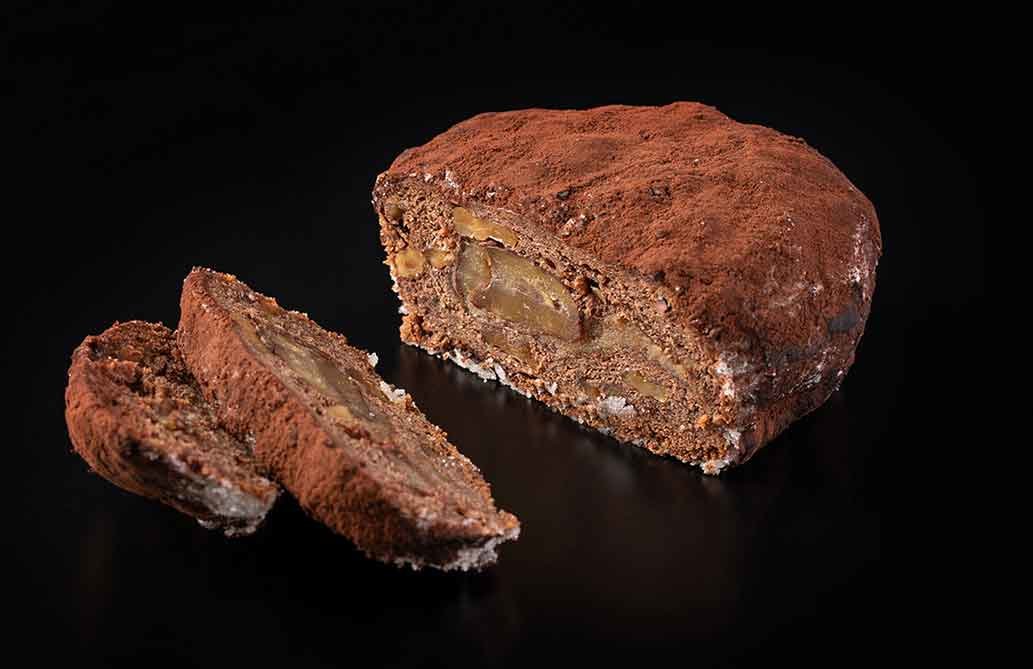 「ダーク シュトーレン」は、オリジナルシュトーレンをビターにアレンジした、ショコラテイストの一品。香り高いブランデーとラム酒に付け込んだマロンやイチジクを練り込んだ生地と、香り豊かな仏ヴァローナ社のカカオニブやココアパウダーを合わせ、リッチで香り豊かな味わいが堪能できる。