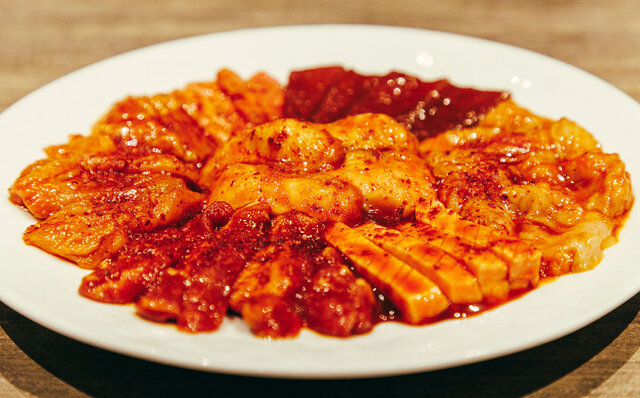 「上ミノ」の柔らかくコリコリとした食感と特製ヤンニョムの甘辛が、やみつきになるひと品。