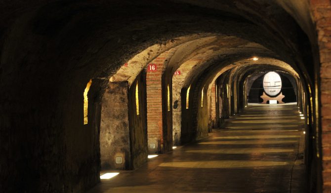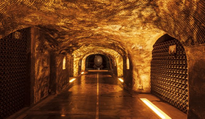 モエ・エ・シャンドンが誇る地下セラー。奥に見えるのがナポレオン カスク。光によるワインの劣化をふせぐため、肉眼では照明が赤いけれど、実際はシャンパーニュ地方を特徴づける白亜紀のチョーク質土壌を削って出来た白い洞窟。この土壌はスポンジのように水を蓄え、干ばつでもブドウに充分な水を供給し、セラーを乾燥から守り、温度を一定に保つ。