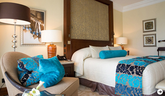 スーペリア・ゴールドクラブ・スイートはリビングとベッドルーム、バスルーム、バルコニーというシンプルな構成だが、ゆったりとしながらも広すぎることもなく、極めて居心地がいい。インテリアはモロッコ様式が基調だが、2年ほど前におこなわれたリノベーションで、スタイリッシュに生まれ変わった。随所に見られるターコイズブルーのアクセントが爽快だ。