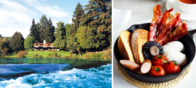 ワイカト川に佇むフカ・ロッジは、フライフィッシング愛好家に長い間親しまれてきた宿。朝が早い釣り好きのために、シェフはゲスト自身が捕まえたマスを調理し、卵とサワーブレッドを用意してくれます。川でなにも釣れなかった日は、ベーコン、スウィートトマトとチリのジャム、クレームフレーシュ、ワイカト川クレスでいただくコーンフリッターはいかがでしょうか。