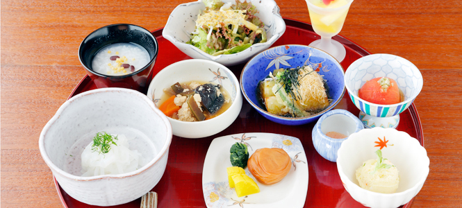旬の味を楽しむのは、当然ながら旅館を訪れる理由のひとつ。別邸音信(べっていおとずれ)近くの長門市仙崎沖は、日本屈指のイカの水揚げ量を誇る好漁場。透き通るような新鮮なイカが朝食にも登場します。朝から生魚はNGなんていう人も、甘みがあって、ツルッと喉ごしのいいイカソーメンは、癖になってしまうはず。贅を尽くした客室は全室露天風呂付き。朝食の前後もお部屋でゆっくりとくつろげます。