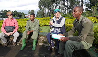 (左)紅茶栽培も盛んなルワンダは、いまやアフリカを代表する農業大国/(右)出発前にはゴリラトレッキングのガイド役、レンジャーとブリーフィングを行う