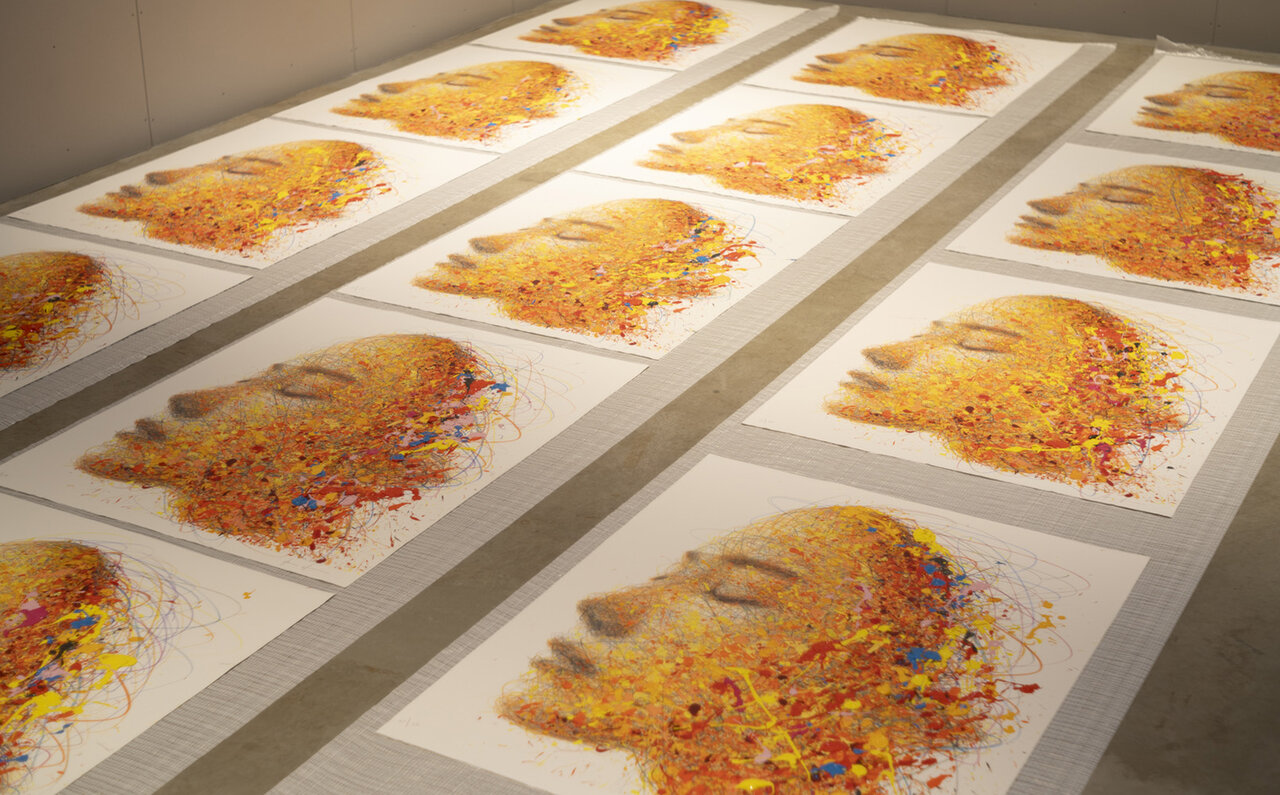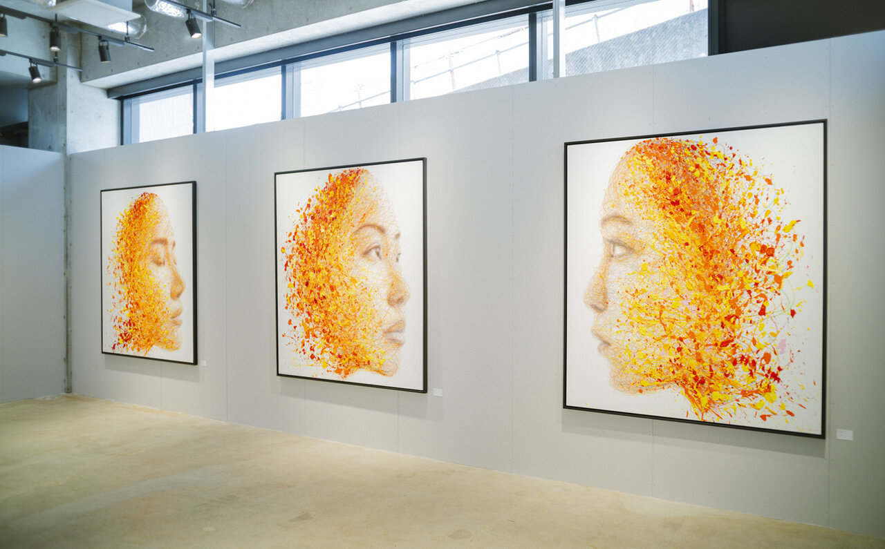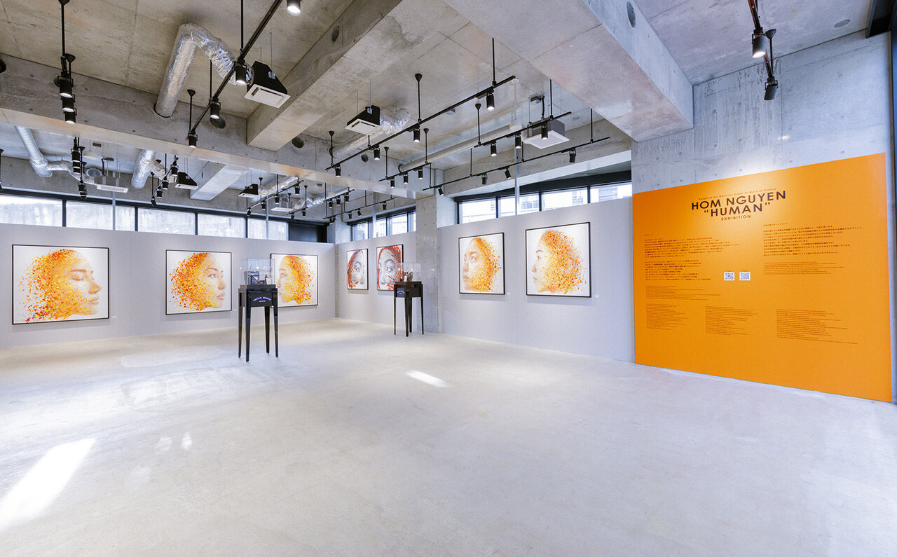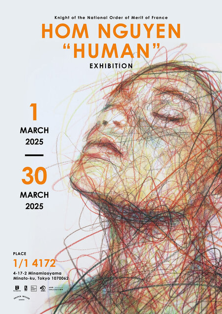 人間の顔や表情を独自の線と色彩で表現するフランス人アーティスト、ホム・グエンが初来日し、個展「Hom Nguyen exhibition "Human"」を東京・南青山で開催中。鋭い線と重なり合う曲線が生み出す肖像画は、近くでは抽象的な線の集合体だが、数メートル離れると人間の顔が浮かび上がる独特の手法で世界的に注目を集めている。