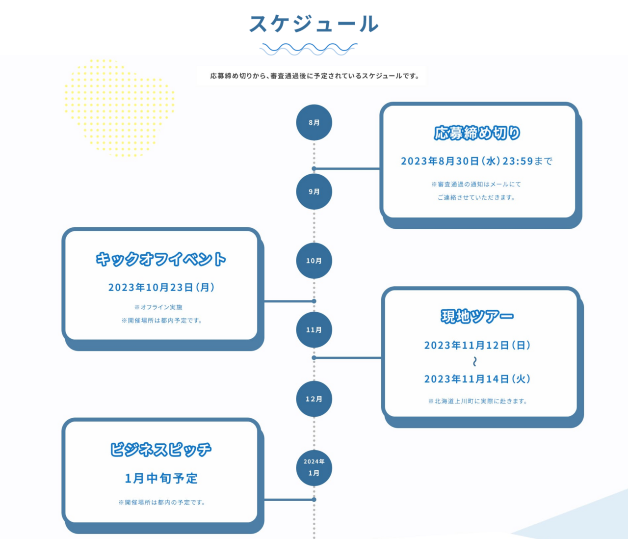 エントリーの締め切りは8月末までとなっており、そこで審査を通過した方は10月後半にキックオフイベント。その後、現地視察(※現地までの交通費のみ自己負担)を行い、今年度中に事業内容を固める。