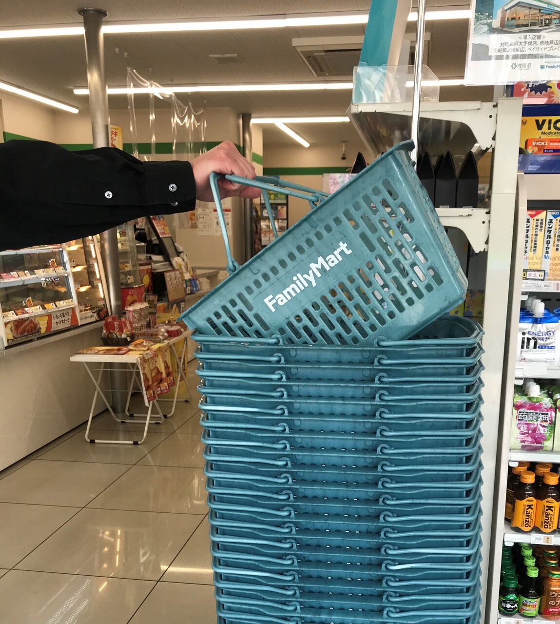 それら海洋ごみを再利用したもう一つの事例がある。ファミリーマート、伊藤忠商事、テラサイクルジャパンの3社が、長崎県対馬市に漂着したプラスチックごみを原材料の一部に使用した買い物かごだ。2021年2月より、ファミリーマートの一部店舗に導入されている。