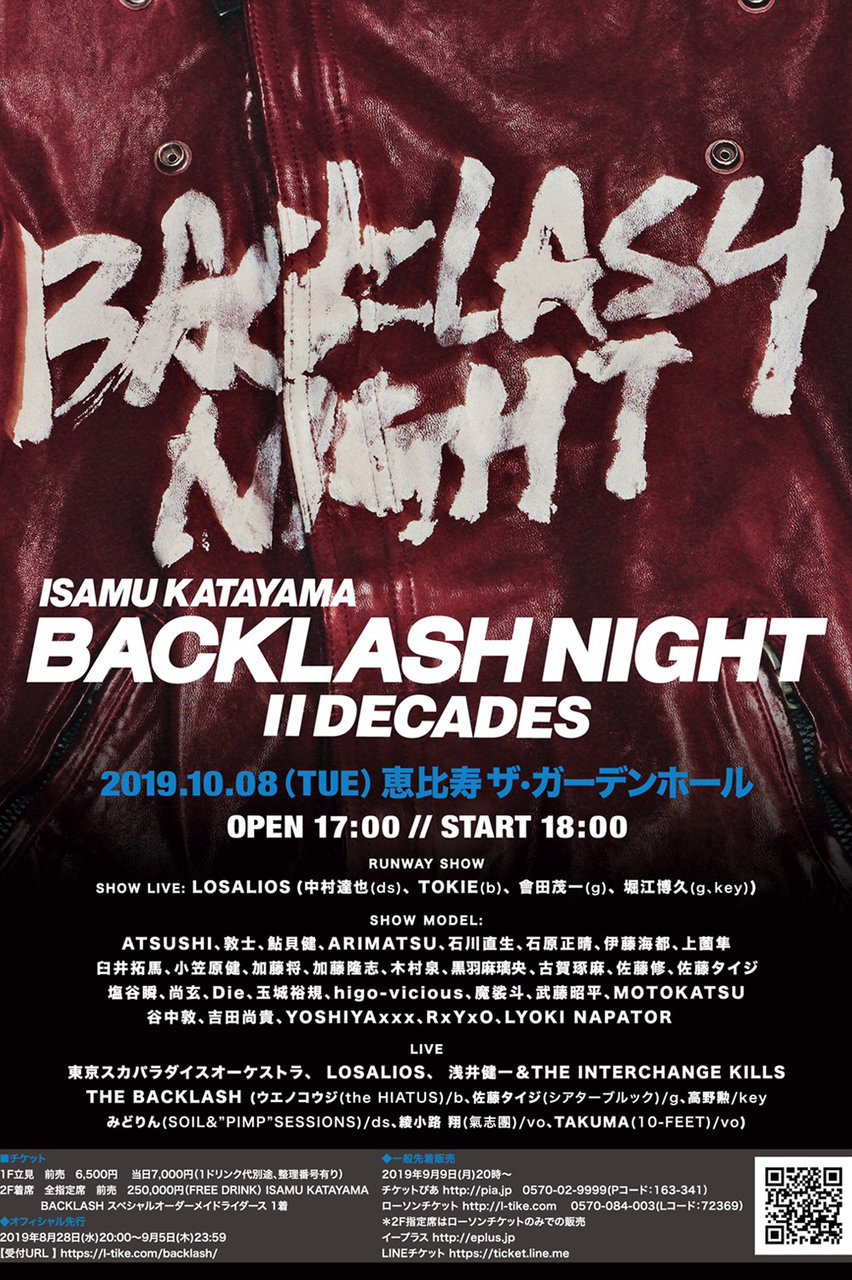 レザーブランド「ISAMU KATAYAMA BACKLASH」の創立20周年を記念したイベント「BACKLASH NIGHT ⅡDECADES」が開催される。ライブとランウェイショーが合わさったスペシャルイベントだ。イベント後には豪華出演者によるアフタートークライブも開催。日程は2019年10月8日(火)。