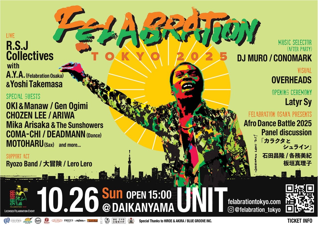 代官山UNITにて音楽イベント「FELABRATION TOKYO 2025」が開催される。15時から23時までの長時間にわたるこのイベントは、アフロビートの創始者であり人権活動家としても知られるナイジェリアの音楽界の巨人、フェラ・アニクラポ・クティを追悼し讃えるフェスティバルだ。日程は2025年10月26日(日)。