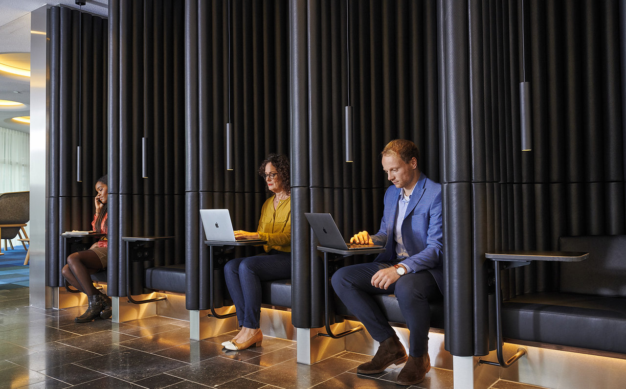 【ポルダー】仕事のエリア:さまざまなグリーンの濃淡で作るモザイク模様。そのカーペットがオランダのポルダ-(干拓地)の広大な牧草地を彷彿とさせる。リラックスした雰囲気の中で仕事ができるエリアだ。110 メートルのLED ライトウォールはオランダの空をイメージしたもの。時間帯によって変化する照明は日の出から美しい日没まで表現している。