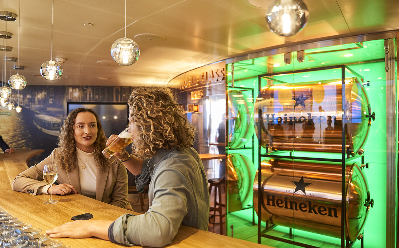 【シティ】食事、飲み物のエリア:ビュッフェコーナー:食事やドリンクを活気溢れる街の風景の中で味わえるエリア。ゲストはその場で調理される出来立ての料理、ハイネケンが特別にデザインしたハイネケンバー、バリスタ常駐のコーヒーバーを楽しめる。スタイリッシュで高品質、そして新鮮な季節の食材や飲み物のコンセプトは、KLM のケータリング会社、Vermaat(フェルマート)が提案。