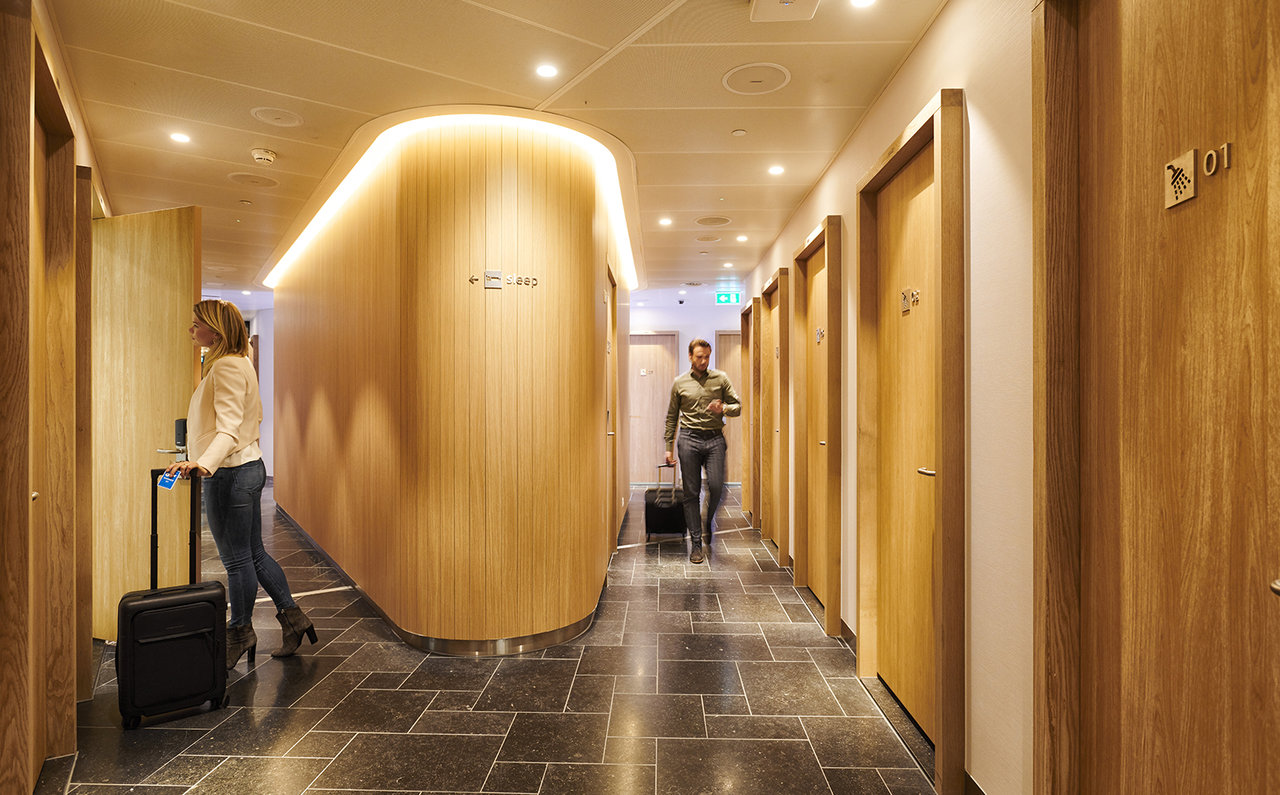【海】寛ぎのエリア:ここでは旅行中のゲストを充電するために必要なすべてのものを提供。このエリアには無料シャワー20 室があり、ラウンジのセルフサービスキオスクで事前に予約が可能。快適で機能的なインテリアの有料のスリーピングキャビンは、プライバシー、静けさ、優れた居住性を提供、3 時間の使用は12400 フライングブルーマイル、あるいは49.50 ユーロ。乗り継ぎや長い旅を癒すのに最適だ。将来的にはシャワーとスリーピングキャビンにはQR コードを使用したデジタルシステムが装備され、予約可能になる予定だ。