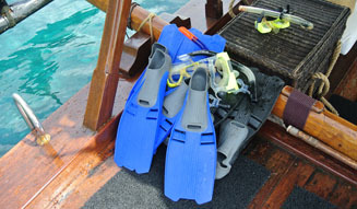クルージングは、自分たちが滞在するアマンキラを海から望みながら浅瀬に到着。アマンキラ近辺の浅瀬の海には色あざやかなリーフフィッシュが見られ、スタッフのリードのもと、シュノーケリングを楽しめる。朝のクルーズの所要時間は約3時間だ。