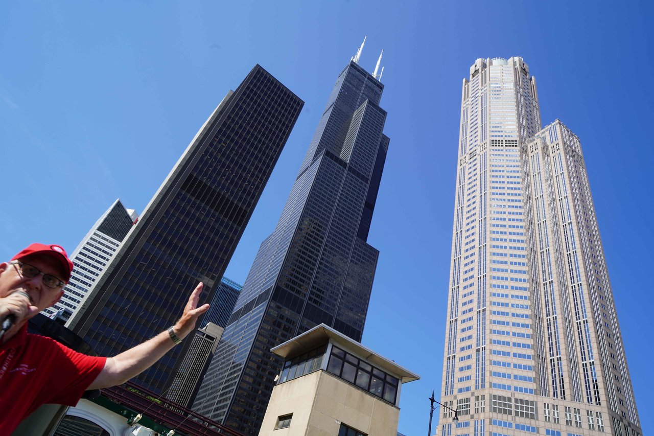シカゴ川の本流からサウスブランチを南下すると左手に一際高くそびえるビルが視界に入る。「ウィリスタワー(元シアーズタワー)」(1971年)だ。摩天楼発祥の地ともいわれるシカゴを象徴するこの超高層ビルは、地上110階建て、高さは442メートルにおよび、2013年にニューヨークのワールドトレードセンターが竣工するまでは全米一高いビルであった。