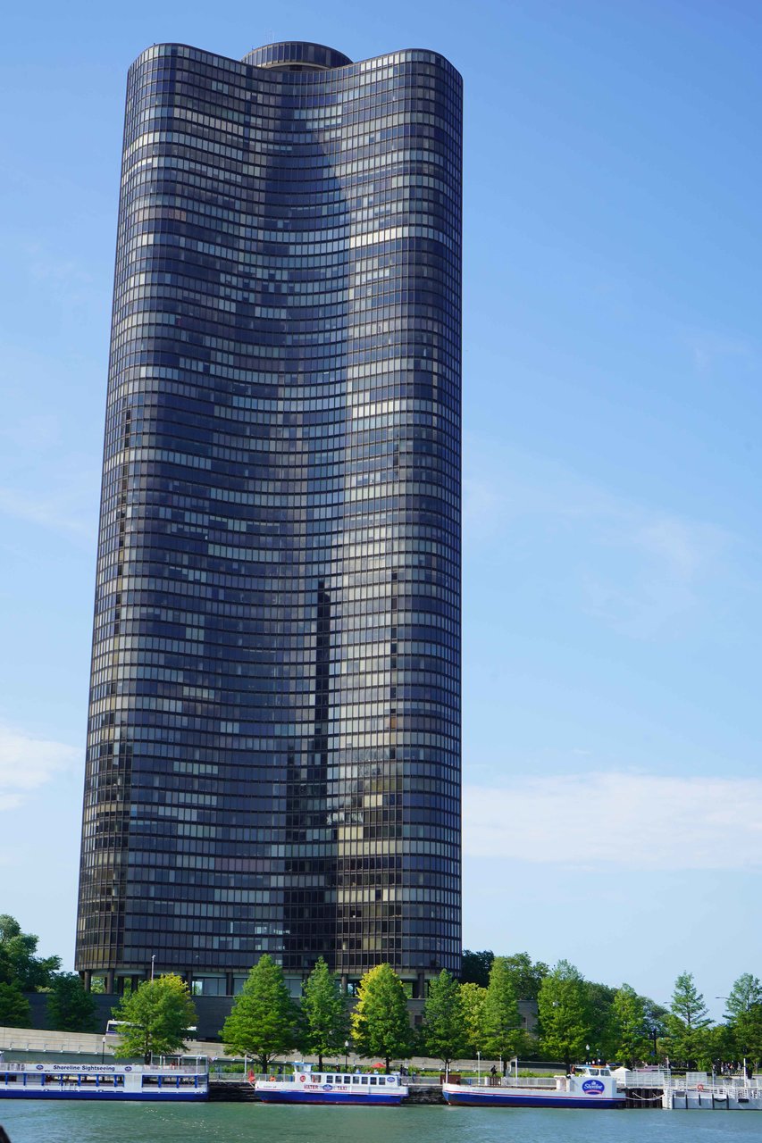 リバークルーズのトリをとるのが、ミシガン湖畔にたたずむ高層マンション「レイク・ポイント・タワー」(1968年)だ。中心から3方向に曲面の建物を配したかのようなユニークなフォルムは、ミース・ファン・デル・ローエが原案をデザインし、彼の教え子である建築家、George Schipporeitと John C. Heinrichが設計を手掛けたもの。黒く輝くこの優美な高層ビルは、まさにシカゴを代表するモダニズム建築といえるだろう。