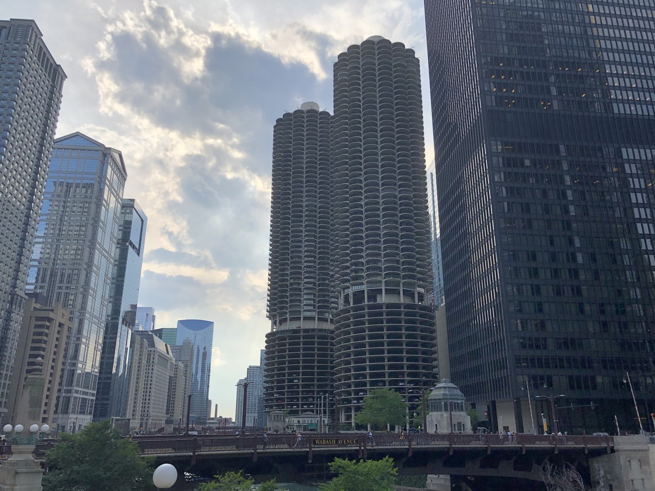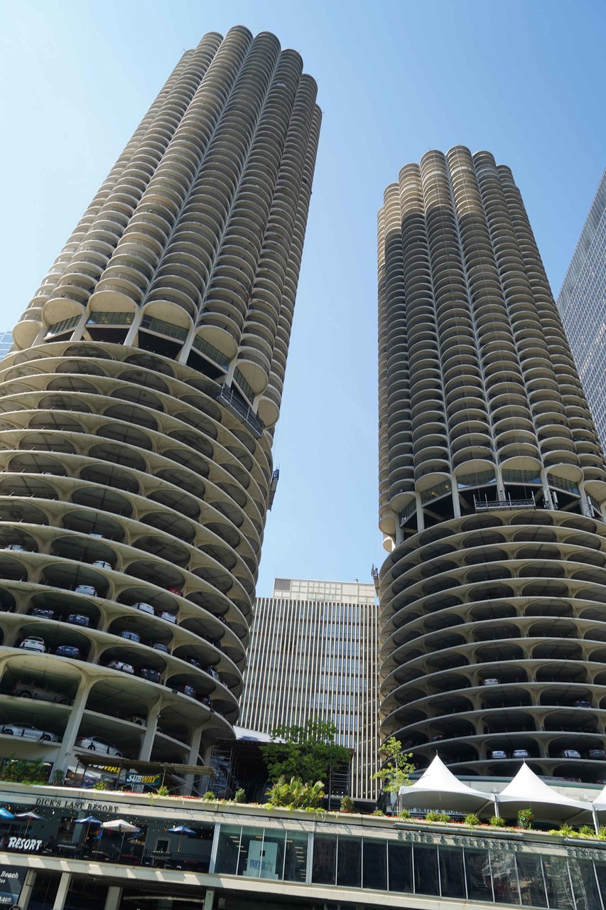 クルーズ船がスタートしてすぐ、シカゴ川を上流方面に目をやると見えてくるのが、トウモロコシのような斬新なファサードが特徴的な円柱のツインタワー「マリーナシティ」(1967年)だ。シカゴにおけるモダニズム建築の代表作と評される同タワー。建築設計を手掛けたのは、独・バウハウスで学んだ地元シカゴ出身の建築家、バードランド・ゴーロドバーグである。