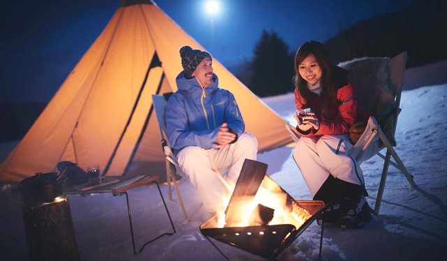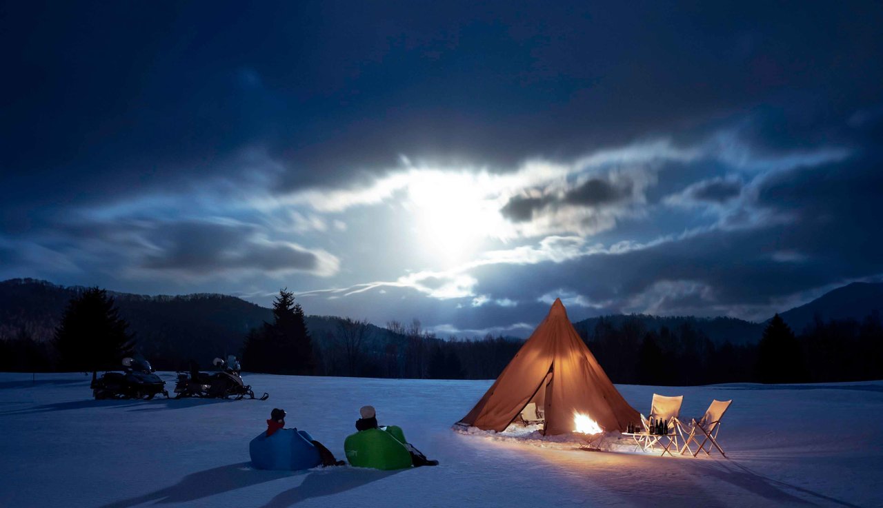 ツアーの途中には「お月見ベース」という、テントや焚火が用意された場所もあり、雪上でゆったりくつろげるお月見の鑑賞席も今年から設けられた。さらにここには「ムーンハーバー」というウイスキーや「満月」という日本酒など、名前が月にちなんだお酒も用意。雪上の特別な鑑賞席に座り、月明かりを浴びながらお酒を堪能する贅沢な体験がトマムでの思い出を一層深くする。