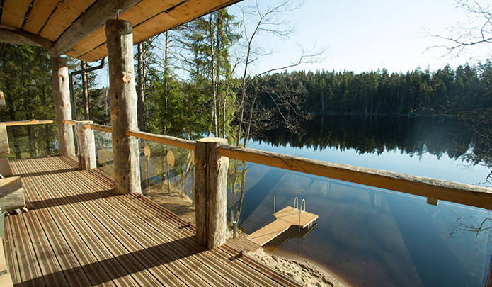 宿泊したのはテンションの上がる湖の前に立つ木造のコテージ!絵になる!「Hawkhill Nature」にはいくつかのコテージがあり、オーダーするとケータリングのサービスもあり、フィンランドらしいサウナも楽しめるという施設。コテージは新しくお洒落というのも女性には嬉しいポイント。
