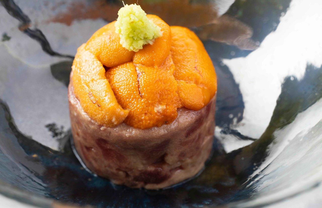 早速、いただいてみるとしましょうか。先付けに登場したのは、「鮪と長芋のあられ和え」。全国随一の収穫量を誇る、青森の長芋と大間のまぐろをあられ切りにして和え、その上に雲丹をのせた逸品です。味付けにフランスのディジョンマスタードを使っているのですが、これが合うんですね~。「そう来たか!」という感じです。