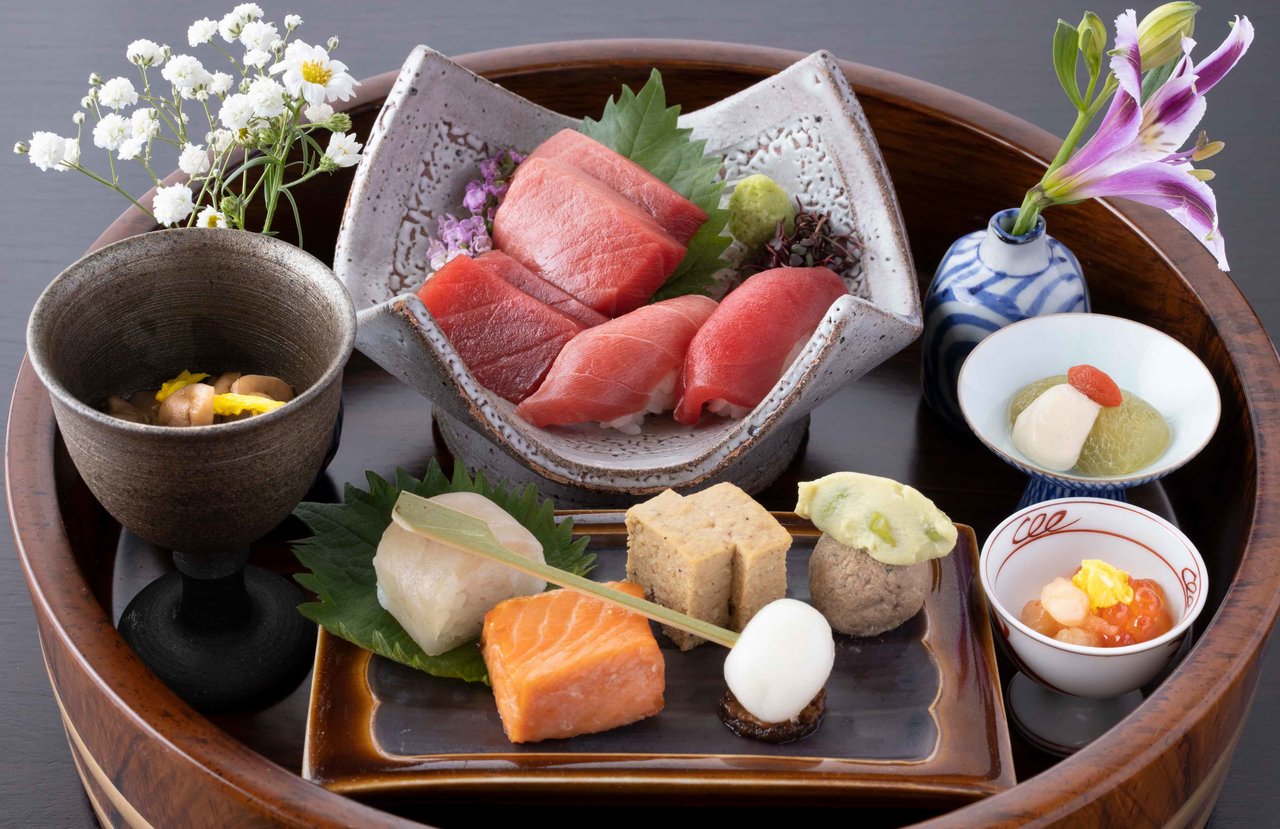宝楽盛り ●八寸 鶏と干しぶどうの松風|白玉胡桃味噌|甘海老紹興酒漬いくら|ぶどうの白和え|鮭の幽庵焼き|鱸の棒寿司|秋刀魚油煮ずんだ和え ●割鮮 大間の鮪のお造り 握り寿司|中トロ|赤身 ●酢の物 土佐酢和え旬の恵
