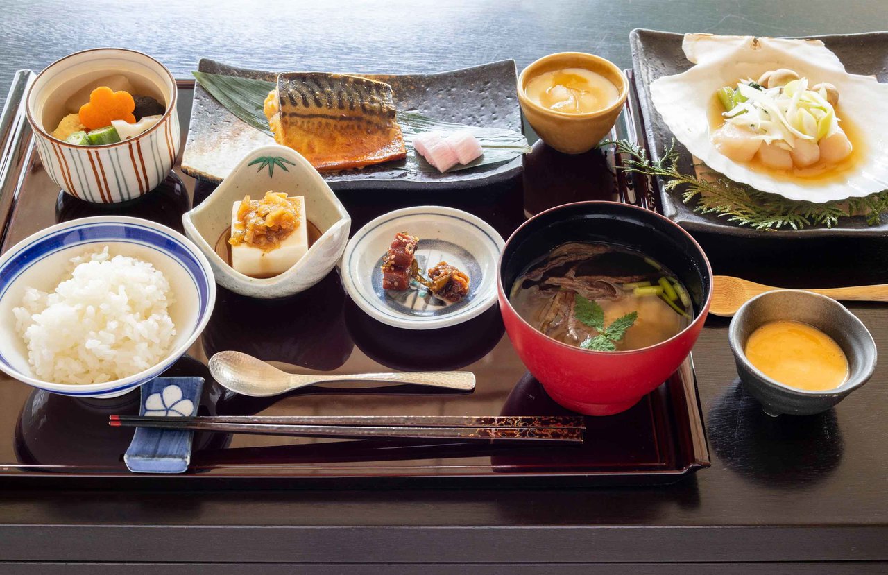 朝食は、「貝焼き味噌」をメインとした和食膳です。貝焼きというのは、鍋に見立てたホタテの貝のなかで、ホタテの身を鰹節やネギ、しめじなどをお味噌汁仕立てにし、卵でとじていただく津軽の郷土料理です。江戸時代に陸奥湾の漁師が貝殻を鍋代わりにして汁物を煮込んでいたことに端を発すると言われていて、旅館や家庭によってレシピは異なりますが、これがまたご飯に合うんですな、ヤバいくらいに。