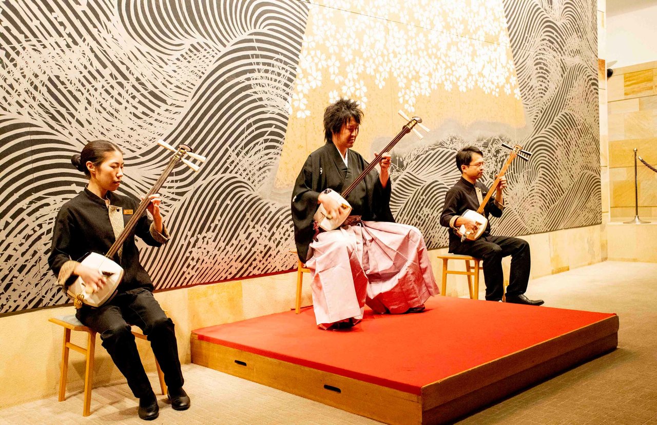 夜は、日本画の巨匠・加山又造氏が津軽をテーマに描いた壁画「春秋波濤(しゅんじゅうはとう)」が抜群の存在感を放つ、ロビーそばのパブリックスペースで、津軽三味線全国チャンピオンの渋谷幸平さんと、渋谷さんから手ほどきを受けた「界 津軽」のスタッフによる津軽三味線の生演奏が行われます。力強く可憐な津軽三味線の音色に、酔いしれてくださいませ。演奏後には、ゲストが津軽三味線を体験できる時間も設けられているので旅の思い出にチャレンジしてみてはいかがでしょう?