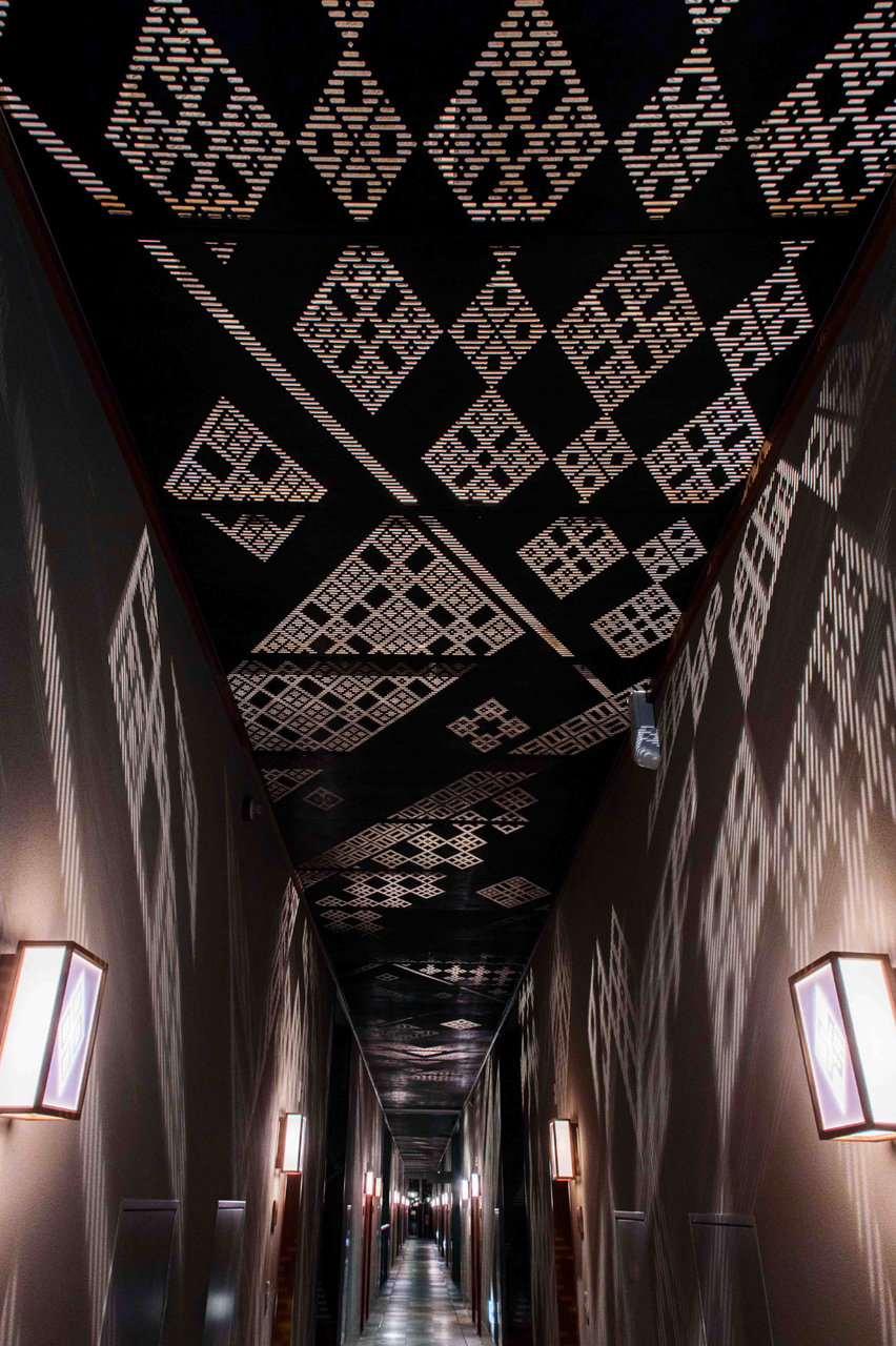 5階にもぜひ足を運ぶべし、ですよ。天井に津軽こぎん刺しの模様を配した、約50メートルの廊下は、「木漏れ日kogin」と名付けられ、海外のメディアによる「ホテルの美しい廊下10選」に選出されました。夜になると、こぎんの文様から光が差し込み、文字通り木漏れ日が降り注ぐような幻想的な世界となります。