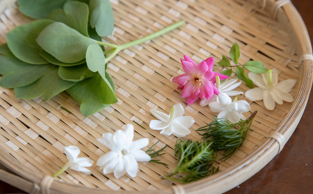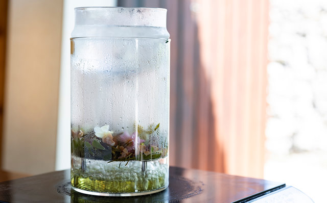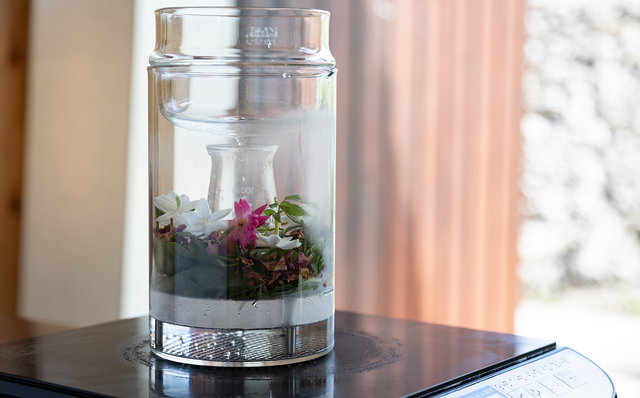 さて、星のや竹富島の命草推しは「食」に止まりません。星野リゾート系の推しに半端はないですからね。この冬からスタートしたのが、命草の香りを楽しめる蒸留水「命草ウォーター」を作るプログラム。施設内の「命草畑」で収穫したフーチバやホーリーバジルなど好みの命草を使用し、命草の香りが楽しめる蒸留水を作るというものです。命草ではありませんが、強い香りを持つローズマリーの使用もおすすめだそうで、実際、いい仕事をしてくれましたよ。完成した「命草ウォーター」は、寝具や衣服に吹きかけて使うことができます。命草セレクトのセンスが問われるのですが、それがまた楽しくて。「これはどんな命草?」「普段はどんな風に使うの?」と、くんくんと香りを確かめながらの命草集めも旅の素敵な思い出です。