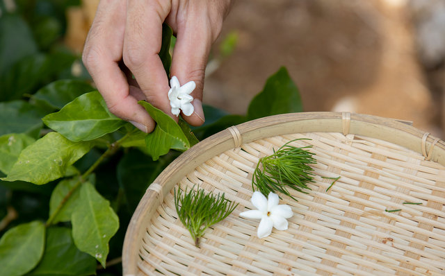おいおい「命草畑」って? と思われた方、失礼しました。星のや竹富島では、2017年から島の畑を継承するプロジェクトをスタートしています。島の農業は後継者不在という大きな問題を抱えています。そんななか、地元で農作物を育てている“おじい”前本隆一さんに、スタッフの小山隼人さんが弟子入り。前本さんの指導のもと、施設内に畑を作り、島の畑を継承する取り組みを行っています。小山さんは、「3年をかけて島に伝わる命草54種を揃え、島の命草文化の継承に貢献するのが目標」ときっぱり。