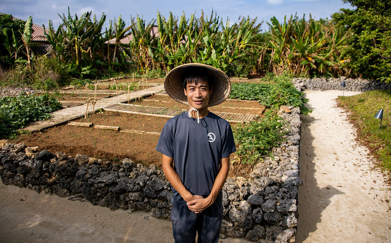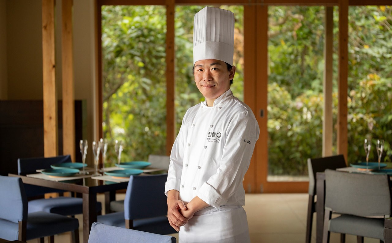 「島の食材は、力強さや素朴さがあるんです。同じ野菜でも本州のものとは水分量が違います」と熱く語るのは、沖縄の離島で働きはじめて3年半、1年前に料理長に就任した、星のや竹富島の若き料理長・伊藤康弘さん。