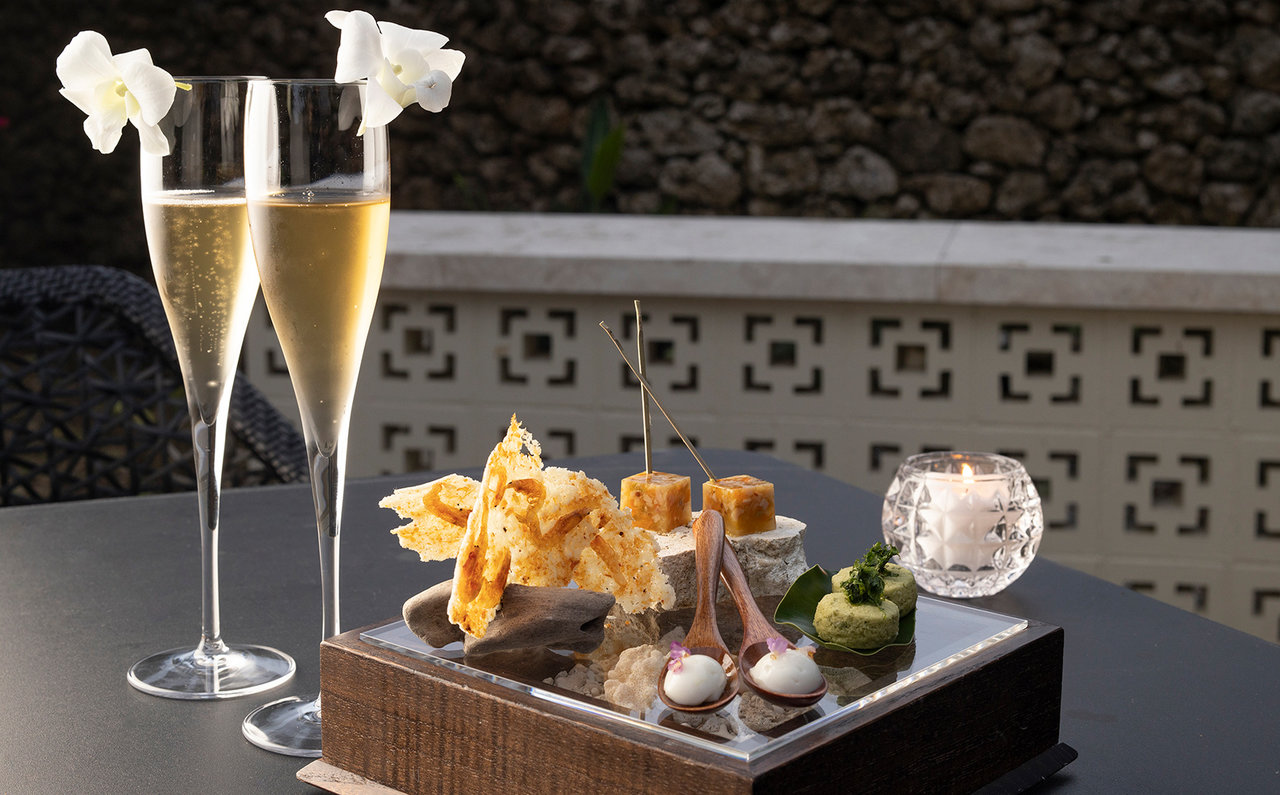 コースは、屋外にある「風のテラス」で、南の島の風を感じながら食前酒とアミューズブッシュを楽しむ「島風(しまかじ)アペロ」からスタート。その後、レストランに移動し、コース料理をいただきます。