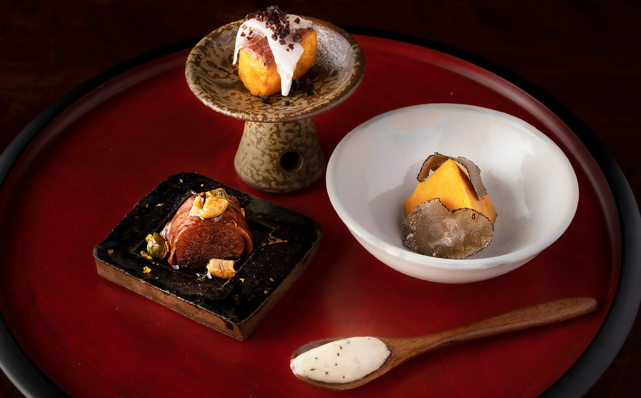 「あかね芋の3種の調理法」は、橙色のあかね芋を、ロースト(焼く)、フリット(揚げる)、ヴァプール(蒸す)の3種の調理法で味わう一皿です。ナッツが香ばしいローストは「オレンジの香りでアクセントをつけました」(伊藤さん、以下同)。「かぼちゃのようにこっくりと」蒸したものは、芋そのものが持つやさしい甘みが際立っていました。付け合わせにはトリュフバターやバルサミコソリッドが添えられていたのも印象的です。何もつけずにいただくのも良し、調味料で味変を楽しむも良し。芋の振り幅の広さに拍手喝采です。