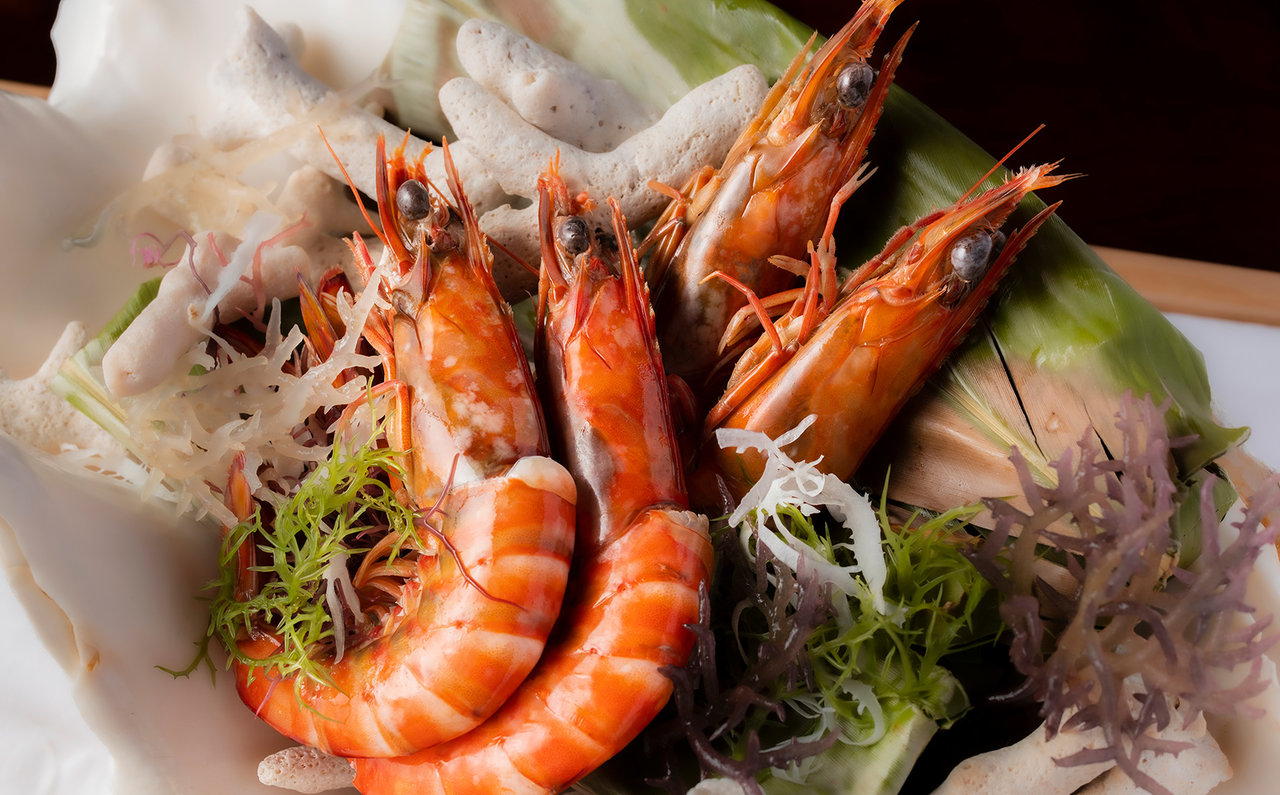 一部の料理をフィーチャーし、詳しくお伝えしましょう。「車海老のサンゴ焼き 命草ソース」は、竹富島が誇る車海老を、熱したサンゴで蒸し焼きにした料理。見た目のインパクトもなかなかです。