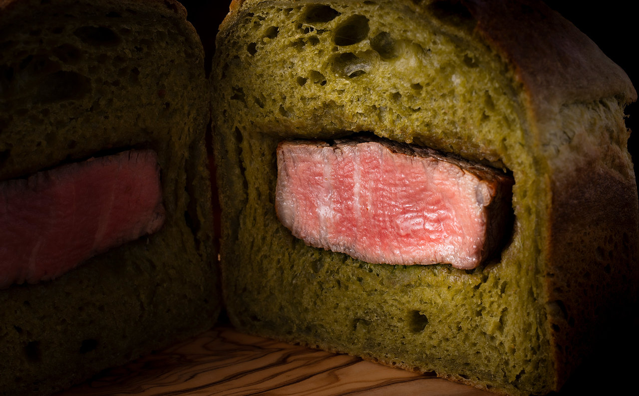 「牛フィレ肉 パン包み焼き 命草のベアルネーズと共に」は、フランス料理のパイ包みから発想を得たメインディッシュ。周囲をかりっと焼いた牛フィレ肉を、「肉にストレスをかけずに火を通したあと、竹富島に自生する長命草やフーチバ(ヨモギ)などの命草を練りこんだパンでくるみ、低温度で時間をかけて焼き上げています」。パンを通してゆっくりと火入れすることで肉がやわらかく仕上がり、また、命草の香りが肉に移るのだそうです。フィレ肉は言わずもがな、肉汁のついた命草パンの美味しいこと。非常に優秀なバイプレーヤーです。「メイン料理にはなりにくい命草ですが、その魅力を全面に出していきたい」という伊藤さんの思いをストレートに感じる一皿でした。
