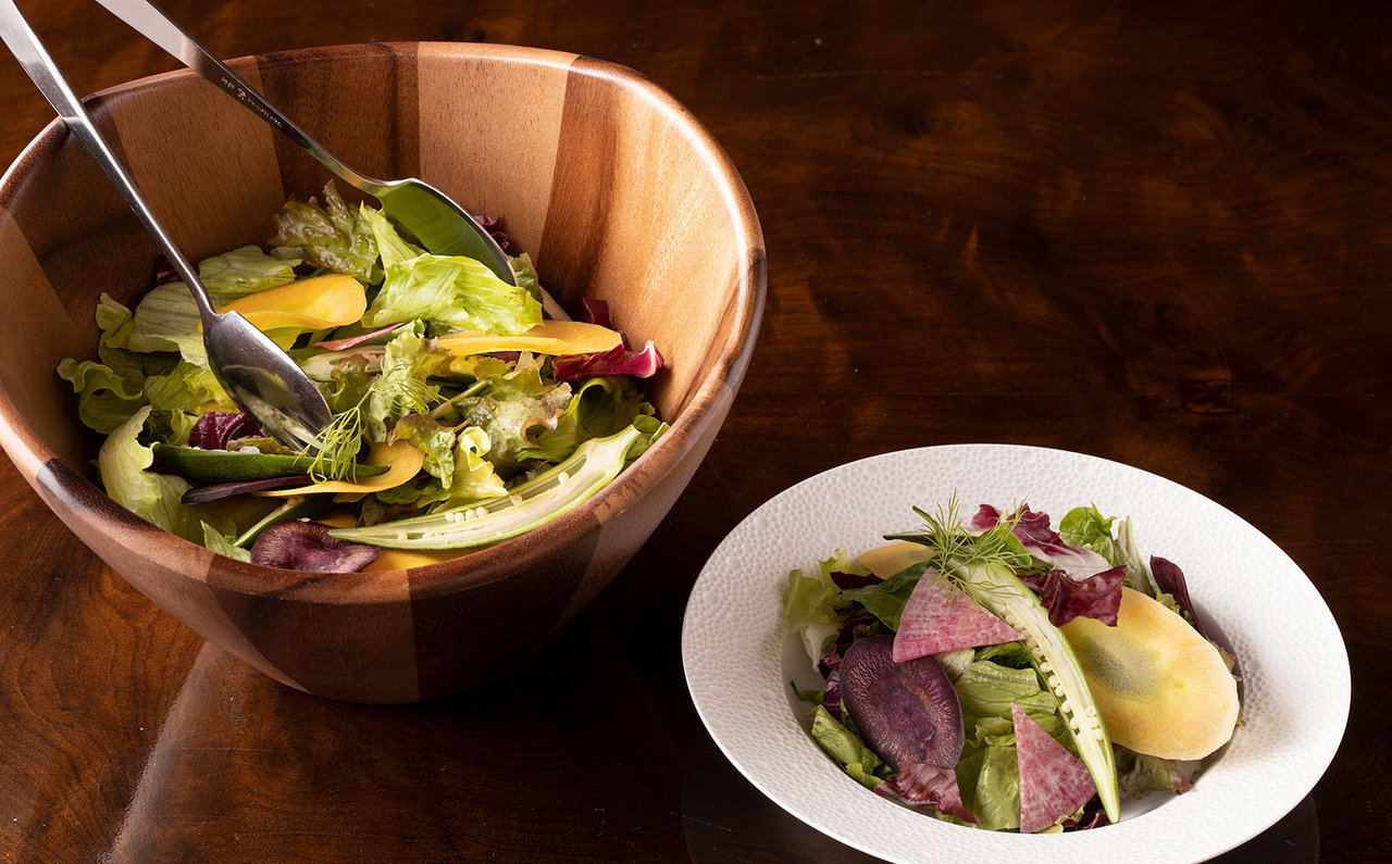 朝食も俄然、命草推しです。「どのようにして命草をたくさん食べていただくか」という思いから誕生したのが、「畑人(はるさー)・ブレックファスト」です。島にんじん、長命草、ハンダマ、ゴーヤなど、冬が旬の命草をふんだんに使用したサラダとポーチドエッグが主役の朝食メニューは見た目も華やかです。
