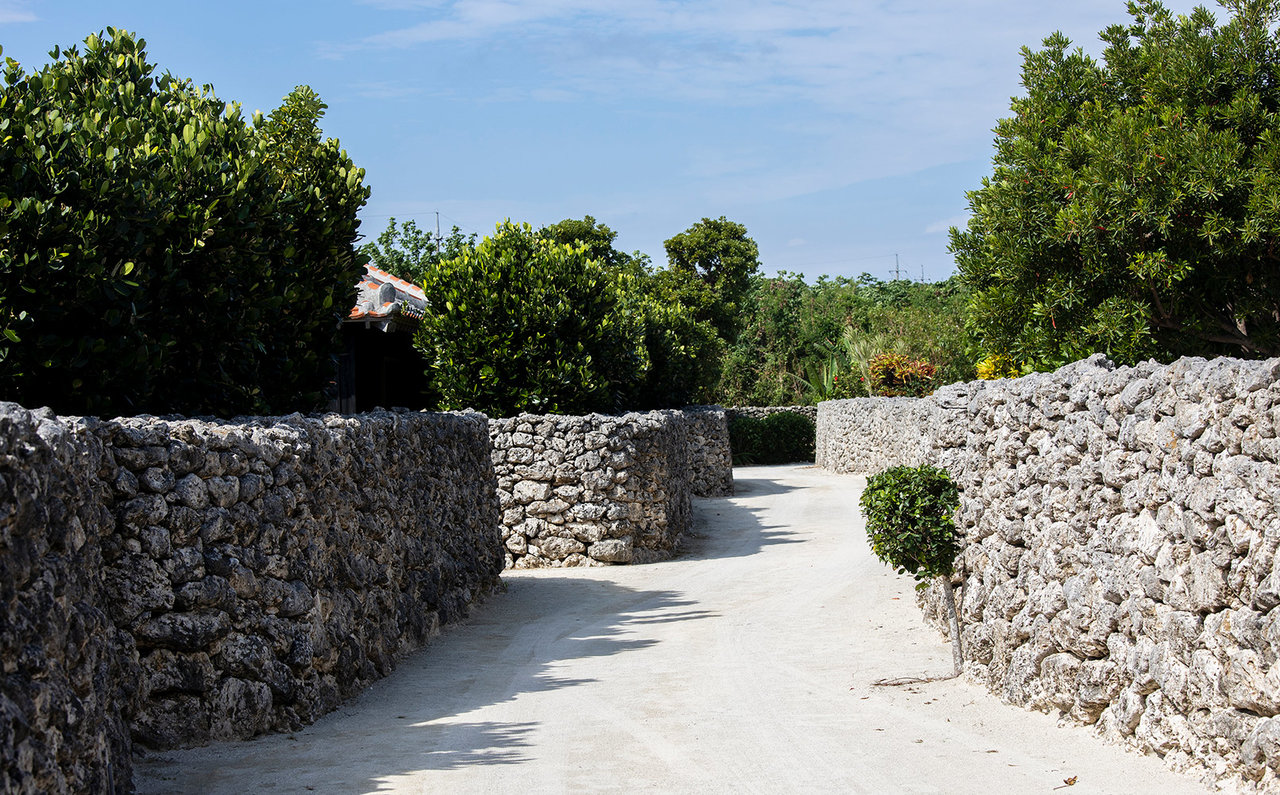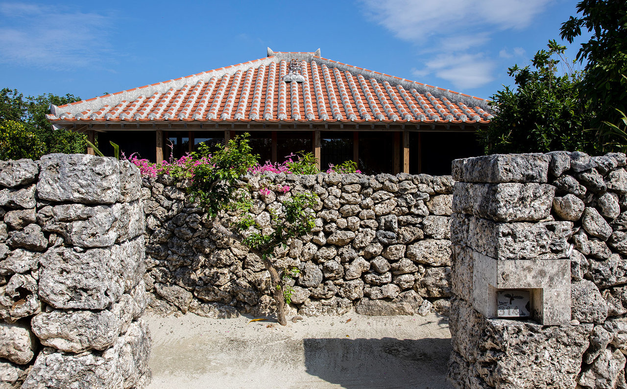 最後に、改めて「星のや竹富島」という施設について紹介しておきましょう。2012年、島の東側に開業した星のや竹富島は、港からクルマで約7分の場所にある竹富島の伝統文化を尊重してつくられたリゾートです。約2万坪の敷地に、全48室の琉球赤瓦を使った戸建の客室(ヴィラ)、プール、見晴台、サンゴのかけらである「白砂」の路地、琉球石灰岩を積み上げた石垣(グック)などを配し、小さな集落を構成しています。風が入るように南向きに作られた、各客室の屋根には守り神のシーサーが鎮座していました。客室の正面にある岩壁(ヒンプン)は目隠しの役割を果たすだけでなく、魔除けの意味もあるそうです。