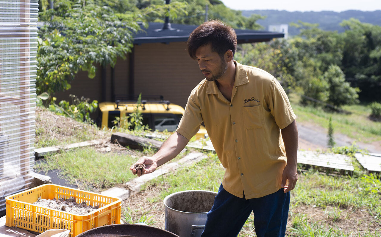 「最初はにんにくから始めました。ただ、種を見に行くと中国産ばかりでした。そこで探して食べ比べて見つけたのが愛媛の在来種でした。島から出る生ごみ、アイランドブルワリーさんの麦の搾りかすや真珠貝の殻など、いままで捨てられていたものを島内で再利用する意味でも使っています。十分に寝かせて熟成させることで良い堆肥になります。」